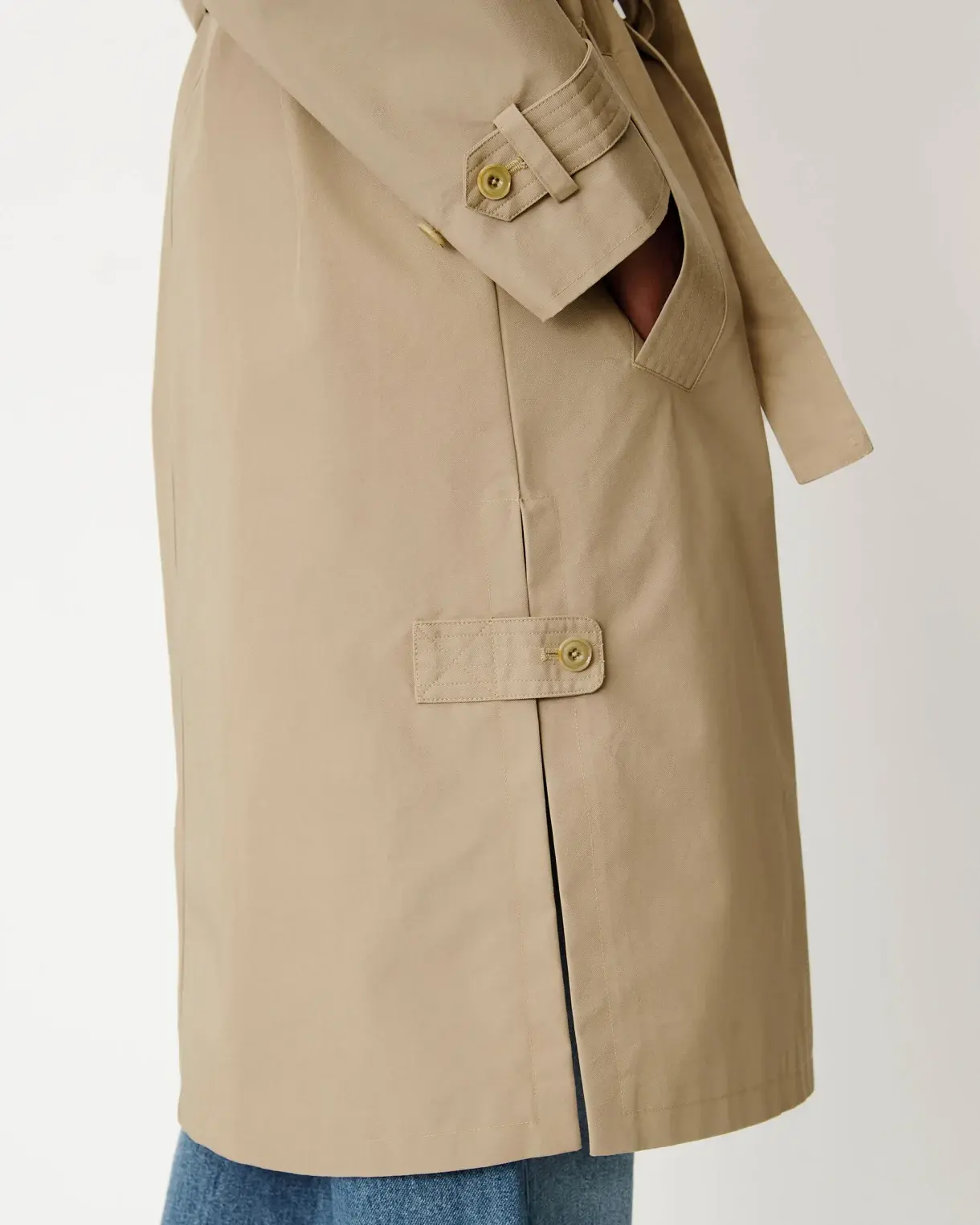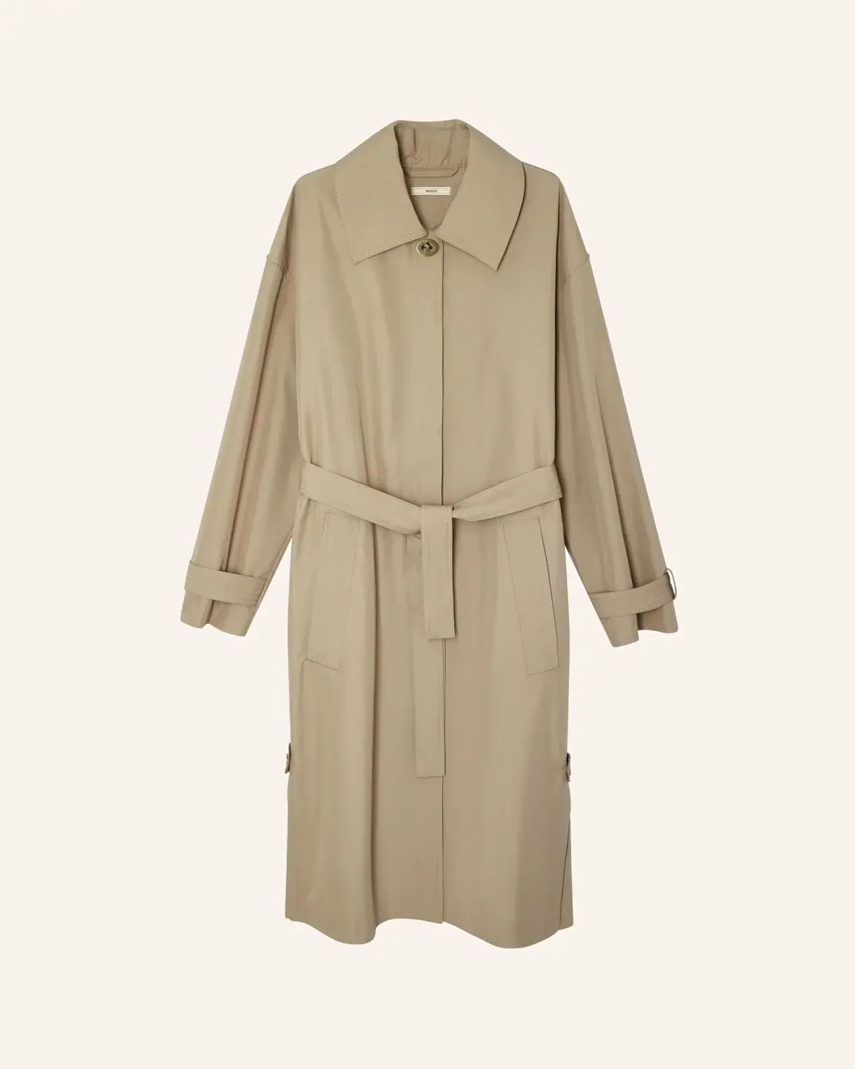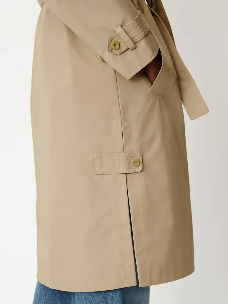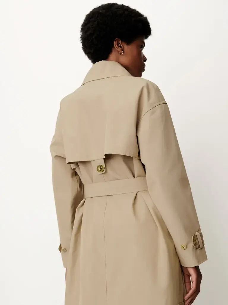 Trench-coat à bavolet au dos, détails de pattes et de fermoirs métalliques en gabardine serrée et légère.