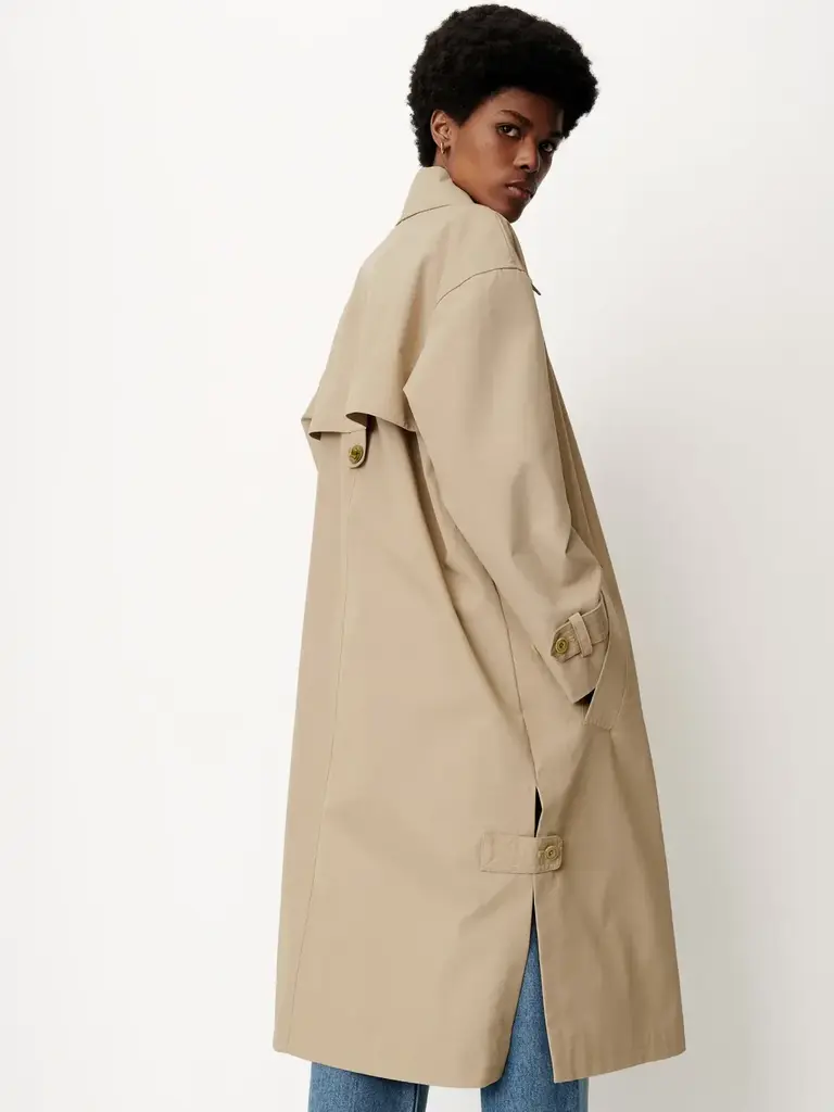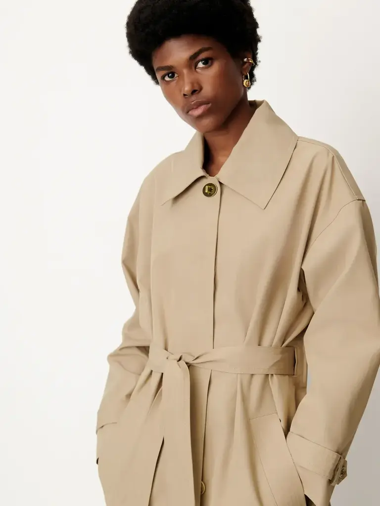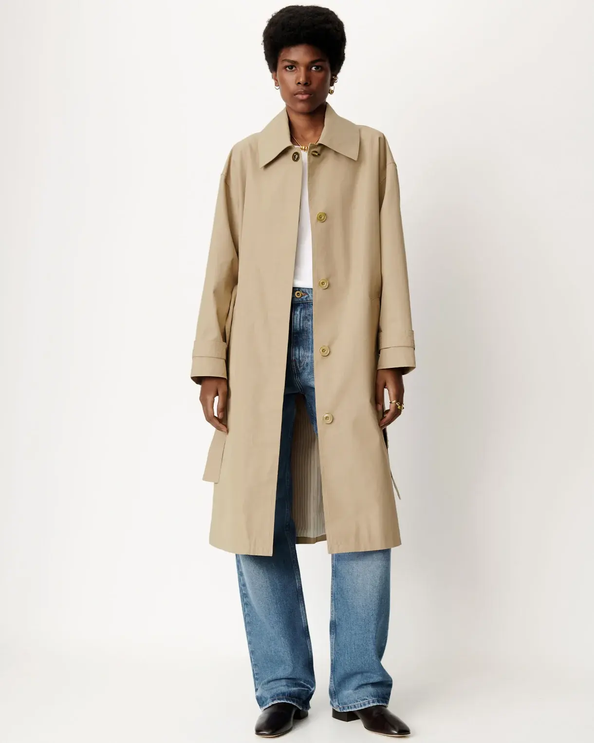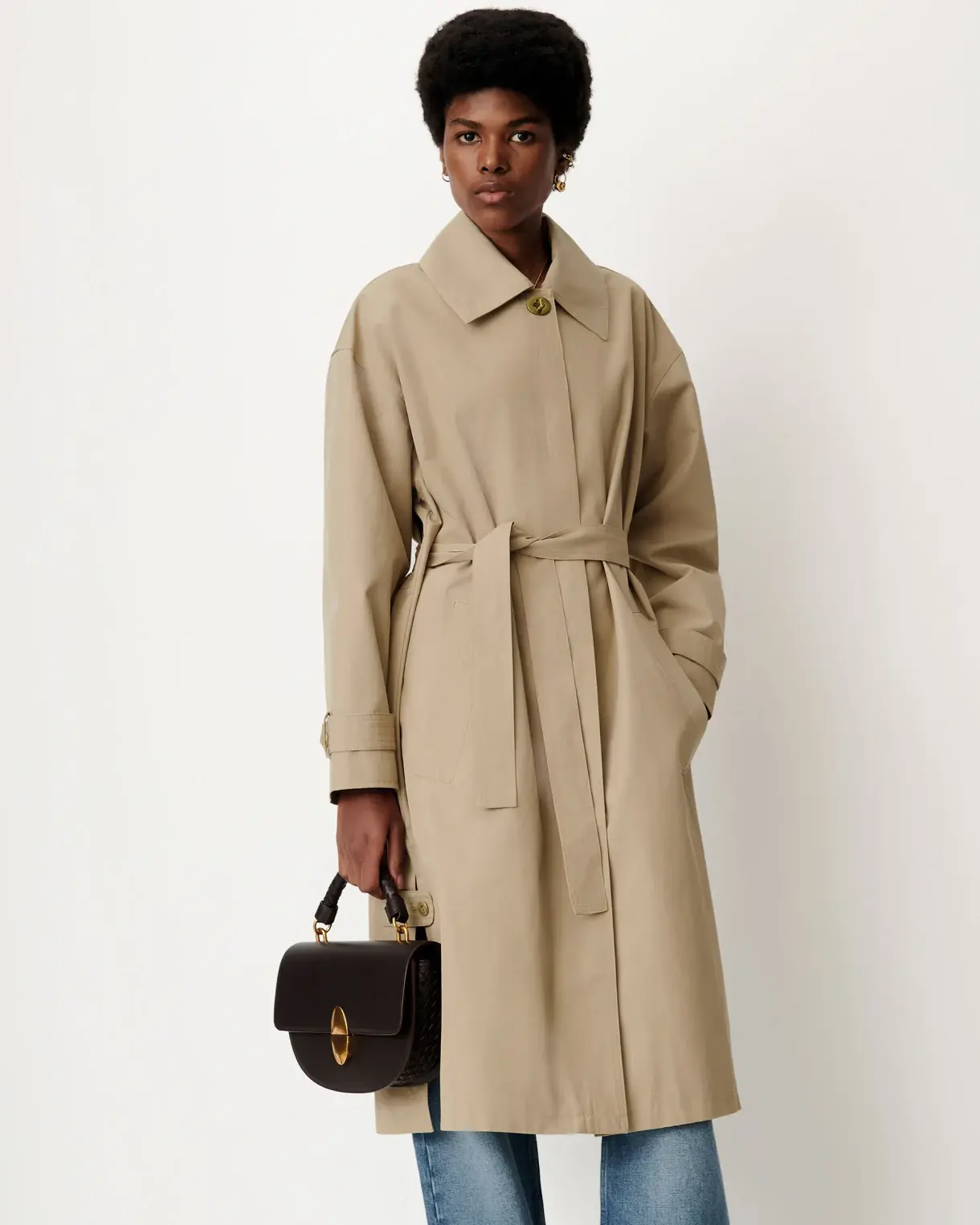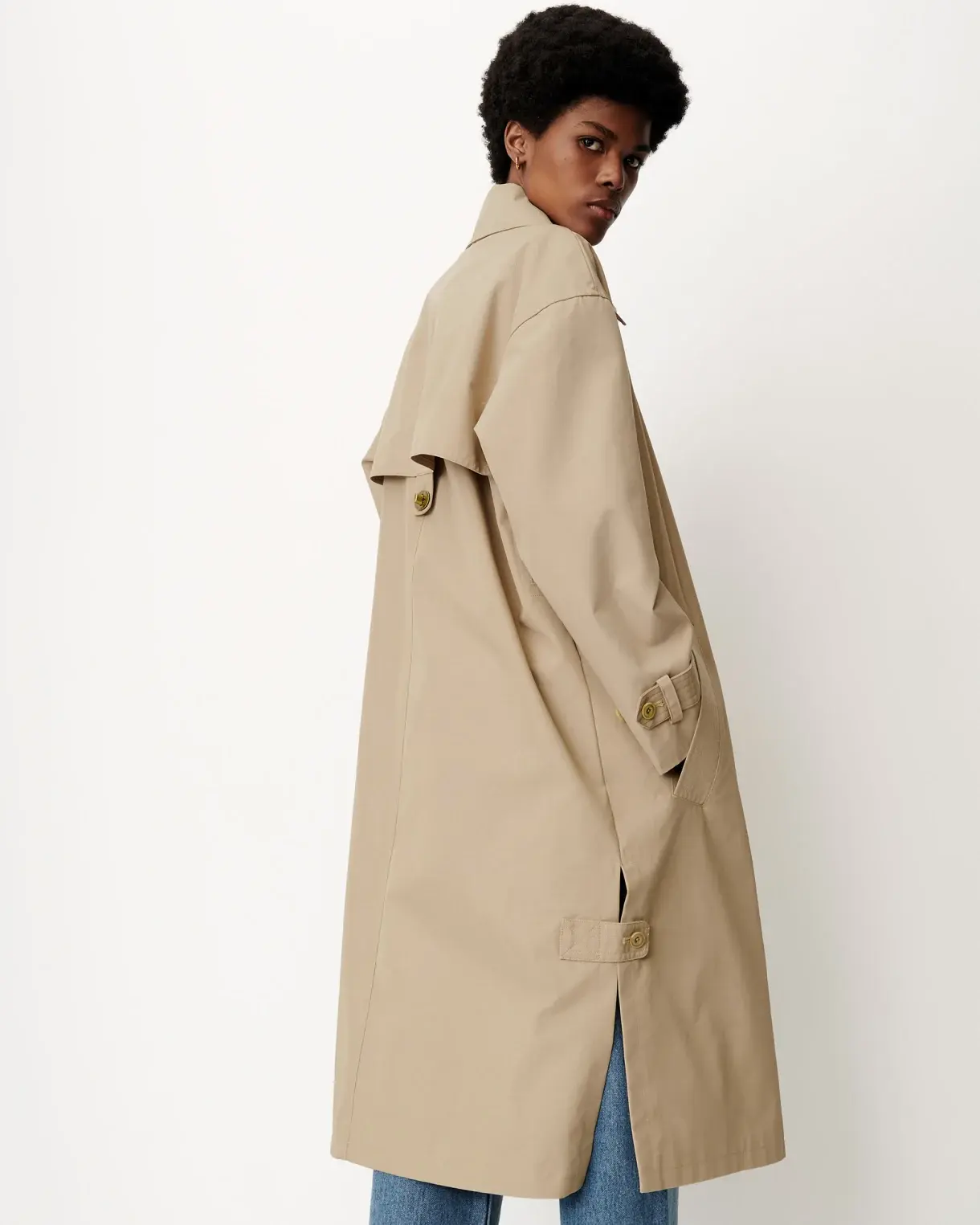 Trench-coat à bavolet au dos, détails de pattes et de fermoirs métalliques en gabardine serrée et légère.