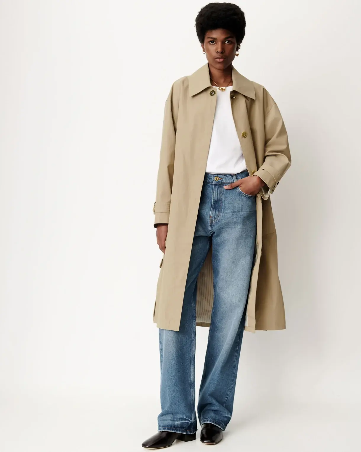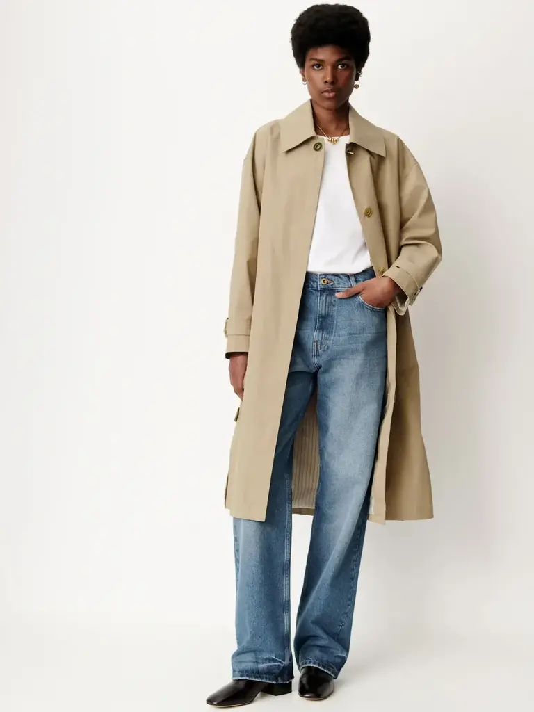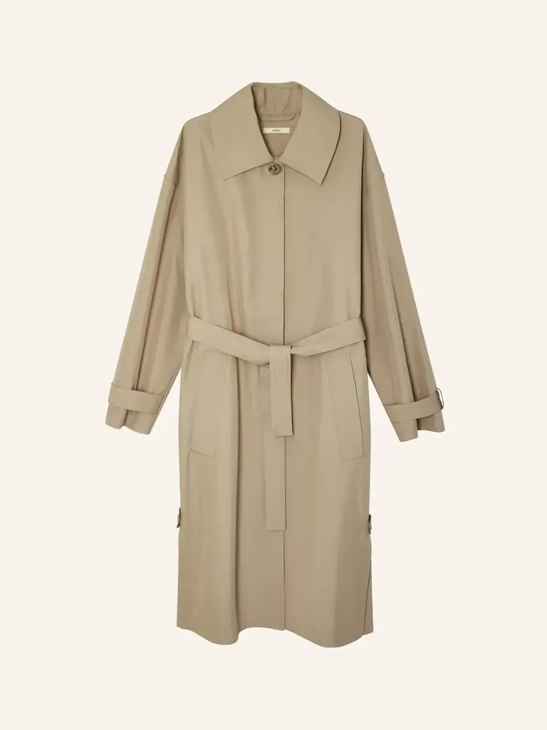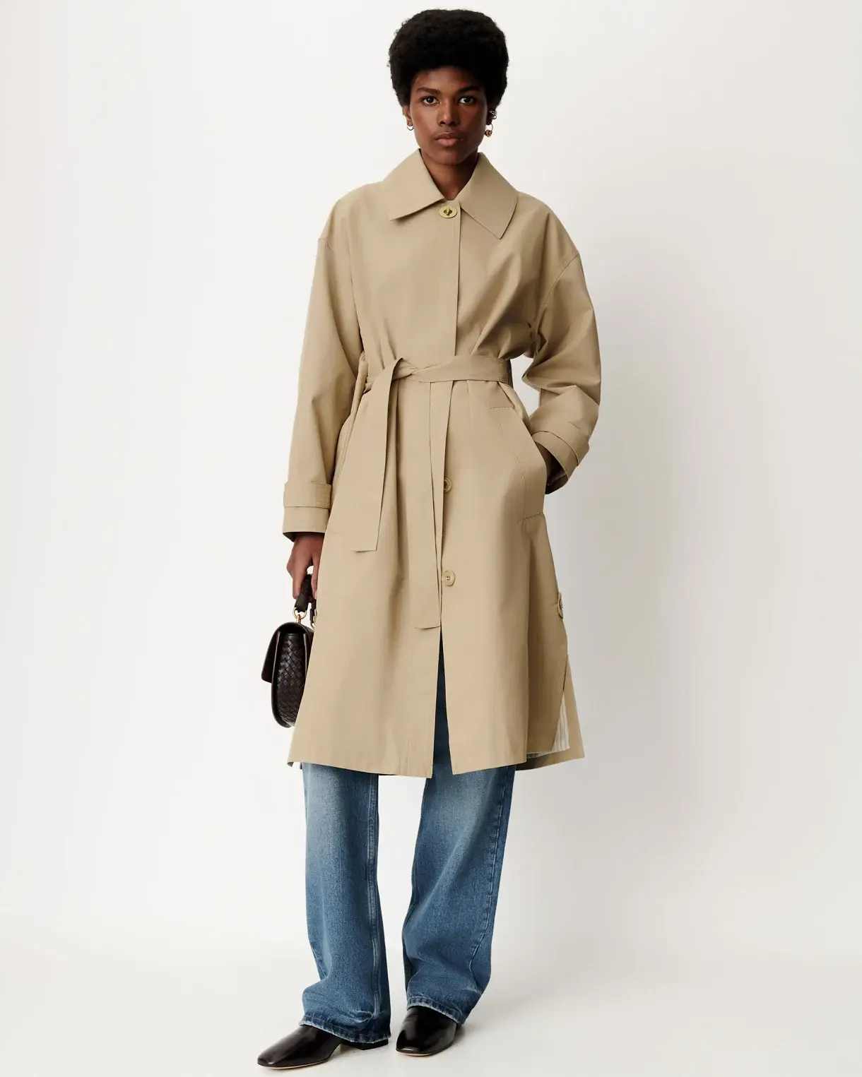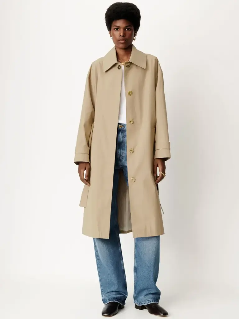 Trench-coat à bavolet au dos, détails de pattes et de fermoirs métalliques en gabardine serrée et légère.