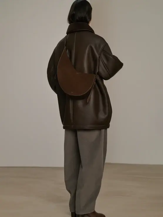 - Pochette amovible en cuir d'agneau à l'intérieur du sac, fermée par un bouton pression.