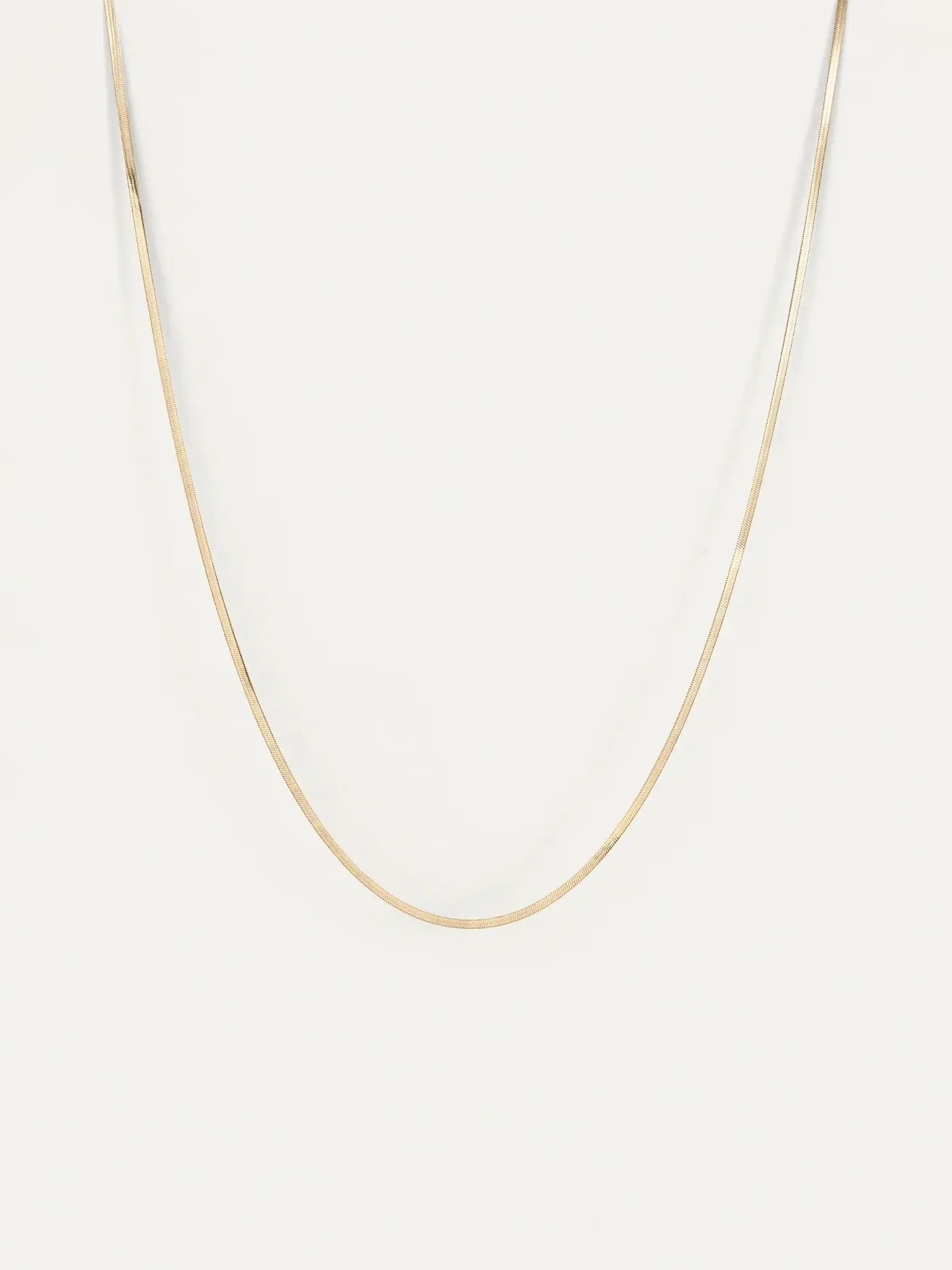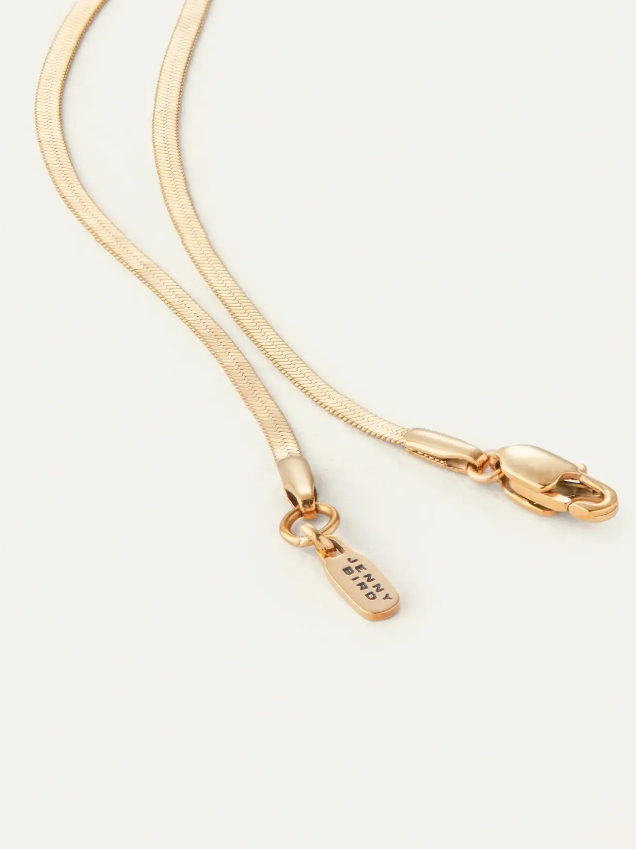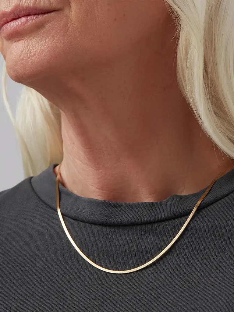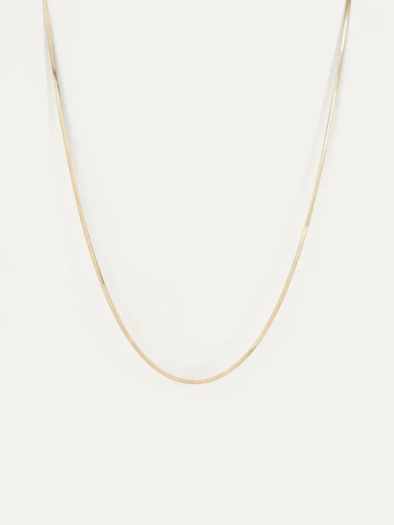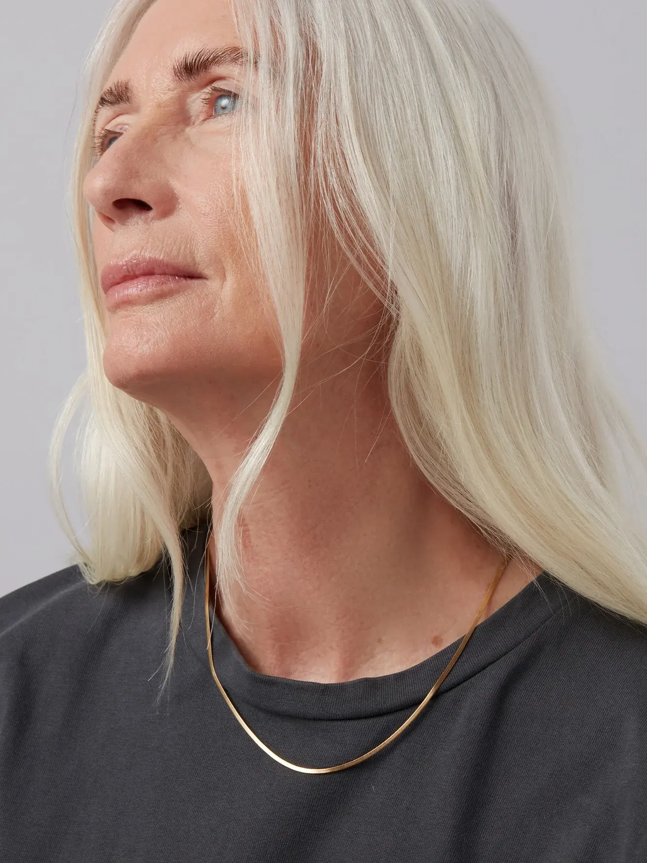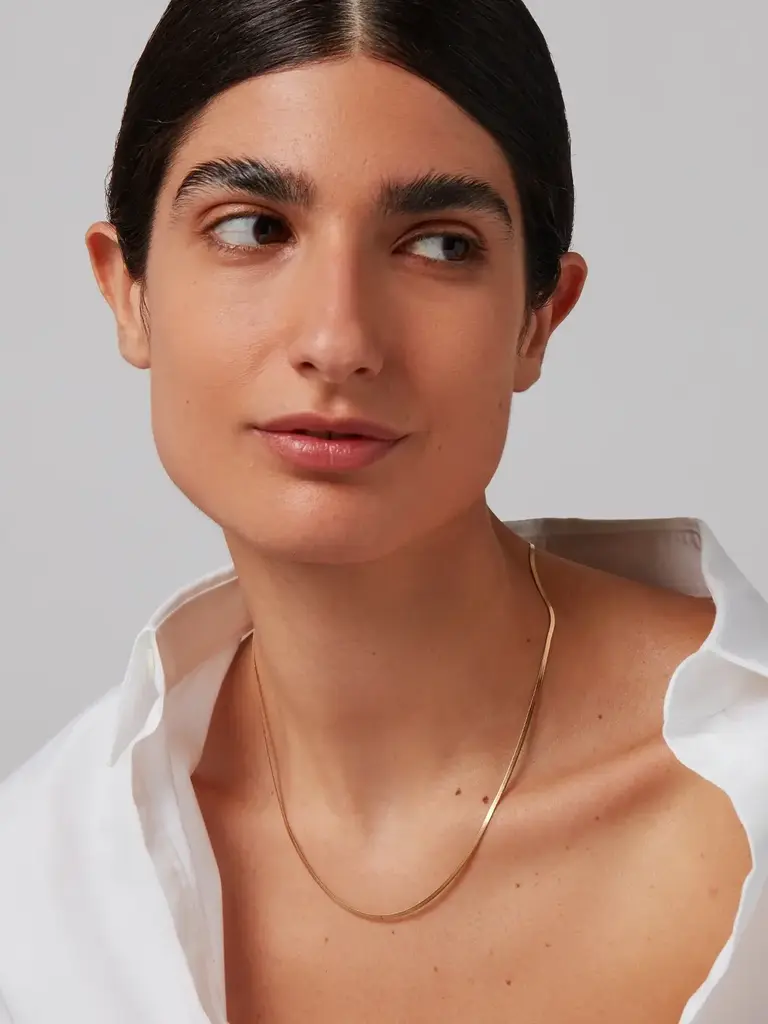 La chaîne Zeina Slim est un modèle résistant à l'eau, doté d'une chaîne serpent à motif chevrons. Elle épouse parfaitement la peau et reflète la lumière de manière éclatante. Finition en or hautement poli.